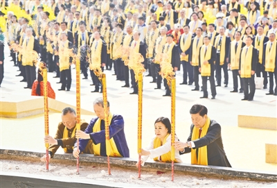 大典共有九項(xiàng)儀程,分別為:盛世禮炮、敬獻(xiàn)花籃、凈手上香、共拜始祖、恭讀拜文、高唱頌歌、樂舞敬拜、祈福中華、天地人和。