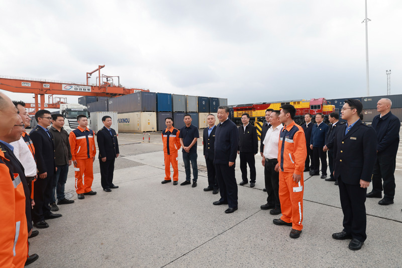 4月22日至24日,中共中央總書記、國(guó)家主席、中央軍委主席習(xí)近平在重慶考察。這是22日下午,習(xí)近平在重慶國(guó)際物流樞紐園區(qū)重慶鐵路集裝箱中心站,同貨車司機(jī)、列車司機(jī)、裝卸工人、場(chǎng)站管理人員等親切交流。新華社記者 岳月偉 攝